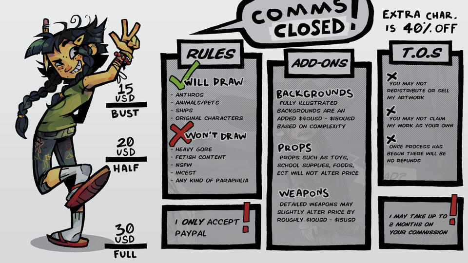 what i will and will not drawi will draw:- original characters- fanart- ships (including polyamory & oc x canon ships)- youtube thumbnails- animals/pets- anthropomorphic animals/furries- cartoonish gore- horrori will not draw:- any type of nsfw or suggestive content- any type of paraphilia (i.e. pedophilia, zoophilia)- incest relationships- heavy gore- fetish content